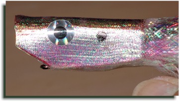 To prepare the foam head, use the head template provided. Cut out your head from white 2 mm sticky backed craft foam. Peel the protective coating from the sticky back and apply the silver transfer foil. If the foil is not available, I’m sure that a shinny silver paint will do. When your head cement is thoroughly dry, use gel type Super glue to attach the head to the hook shank. Attach one side at a time and allow drying time between sides. Align the first side flush with the bottom of the shank and carefully align the front of the belly just behind the hook eye. Take care to align and square the sides so that the cheeks of the mouth are square and equal sized from side to side.