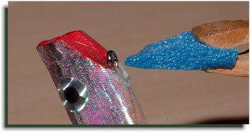 Apply the stick on eyes. Use the black Sharpie felt marker to make the dot. First epoxy the most important areas. Brush in and fill as much of the pocket in the chin area as possible just behind the hook eye. Brush in and heavily coat the red mouth area. Be careful to seal around the hook eye and coat the lip edges. Brush on the final thin coat of epoxy. As you evenly brush on the smooth final coat, keep turning the fly so that cupped front face is uniform and heavily coated.