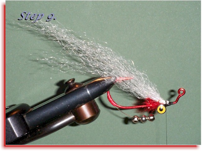 Step 8: Reposition hook in vise, shank down. Advance thread to the first/bottom wing tie in position at 1/3 the distance between the eyes and the jig bend. Hold a 3 and 1/2 hook shank length bunch of White Flash ‘N Slinky between your finger and thumb at approximately the mid point of the bunch. With your free hand, pinch and pull about 1/3 of the fibers from one end so that they are about a 1/2″ to 3/4″ longer than the rest. Roll the bunch of between your finger and thumb of your hold hand to mix the fibers. Then, again with the free hand, pull 1/3 of the mixed bunch another 1/2″ to 3/4″ further out. Mix again by rolling between the finger and thumb of your hold hand. This will put near identical tapers on both ends of the bunch. Position the bunch on top of the hook with approximately 40% of the entire length extending rearward towards the hook bend from the tie in point and approximately 60% extending forward over the hook eye. Secure with three or four turns of thread moving rearward.